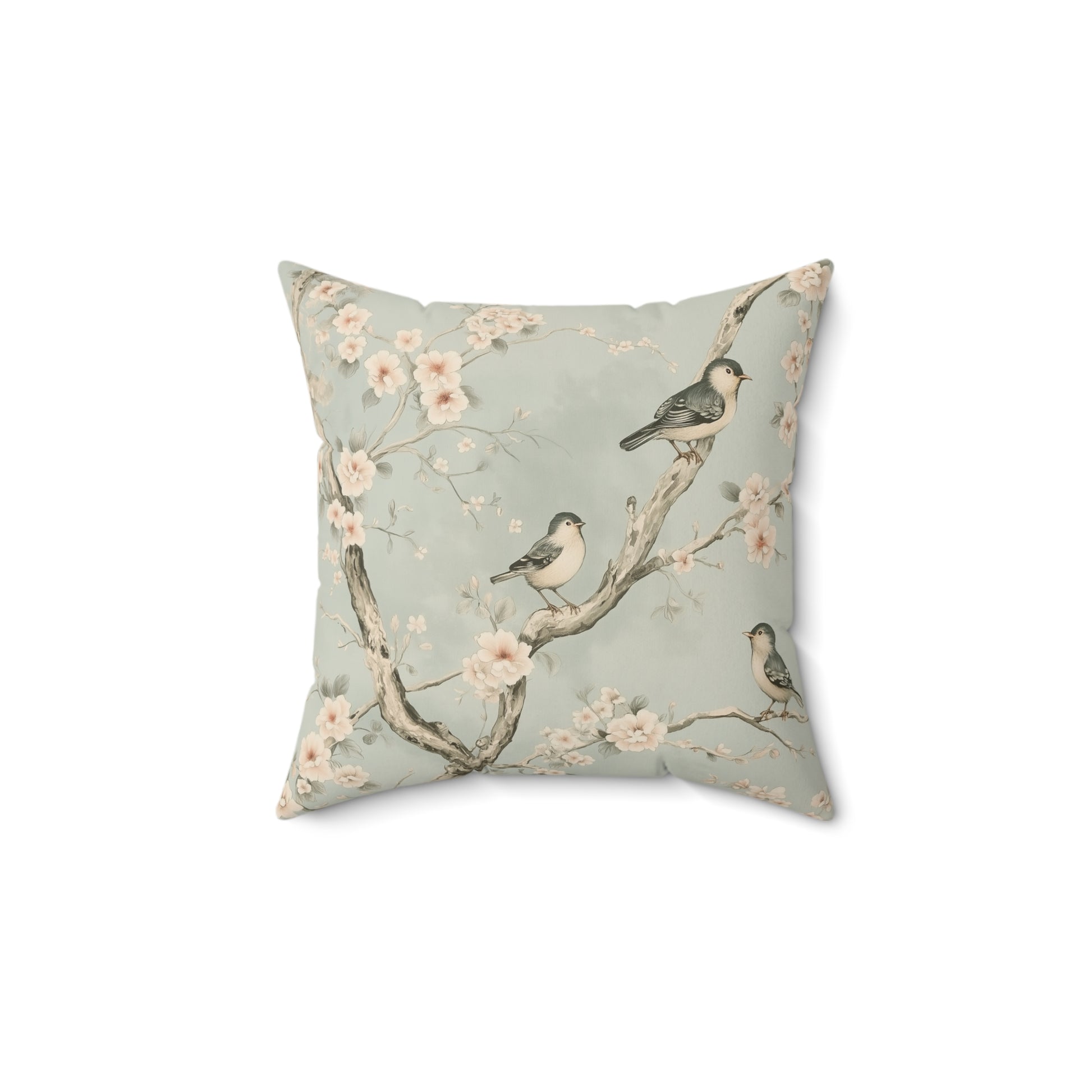 This throw pillow features a delicate bird-and-blossom design that brings a gentle springtime touch to your space. It enriches a sofa, armchair, or bed with soft artistry and quiet charm.