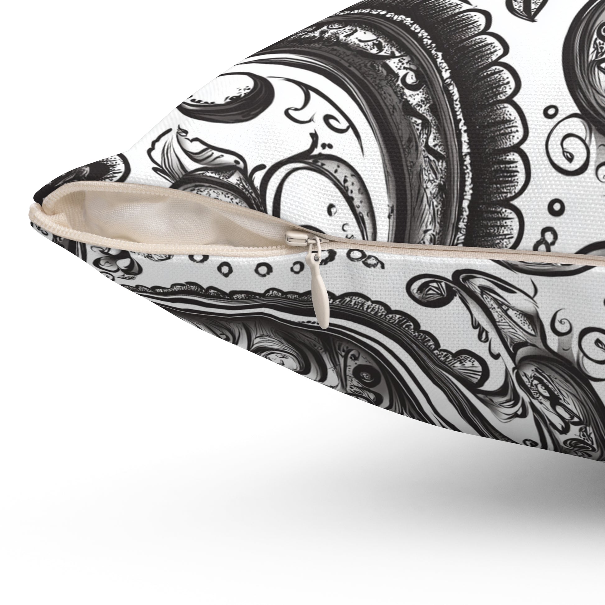 This throw pillow displays a refined paisley motif with graceful curves and a timeless charm.