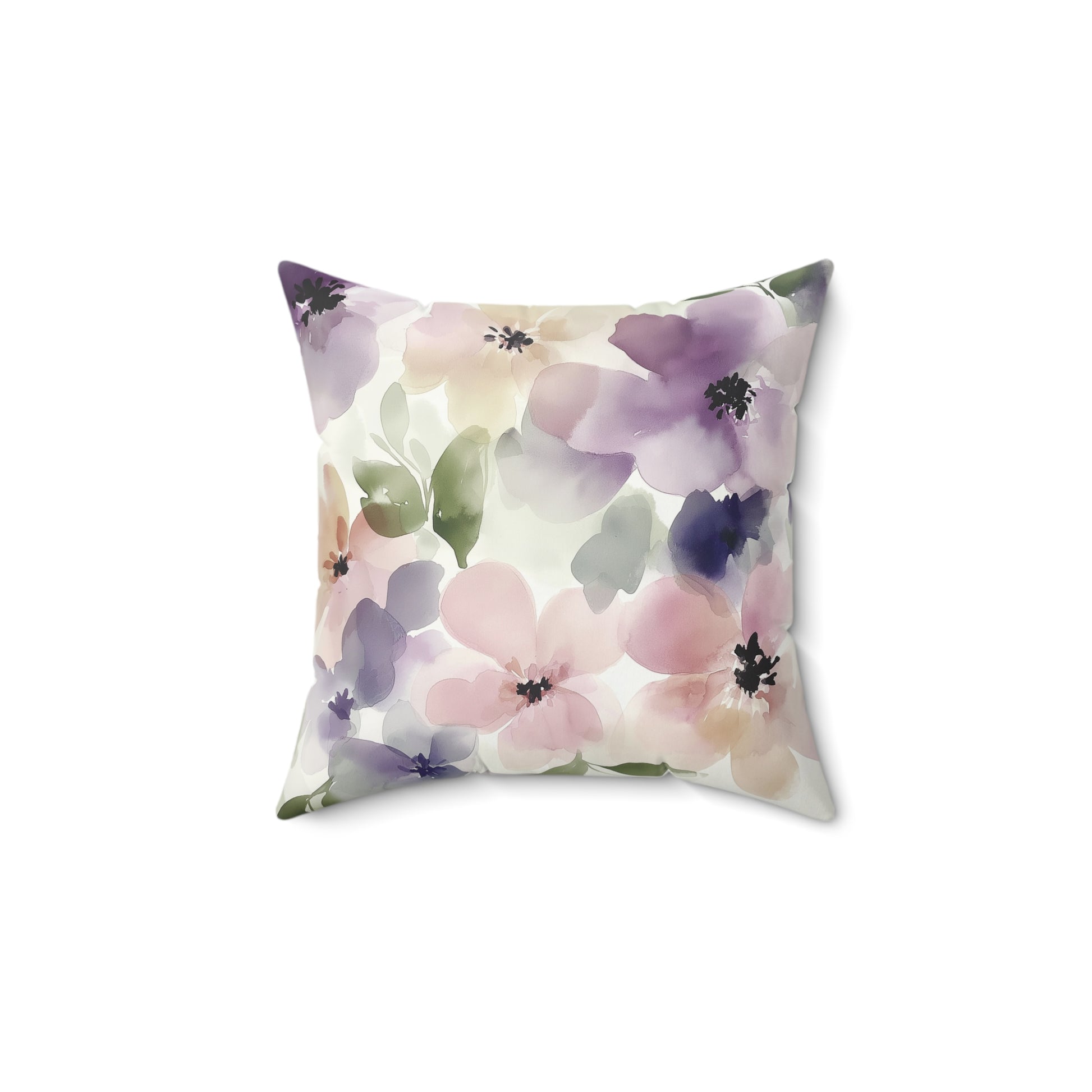 This throw pillow features a soft watercolor floral design that adds gentle elegance to a sofa, armchair or bed.