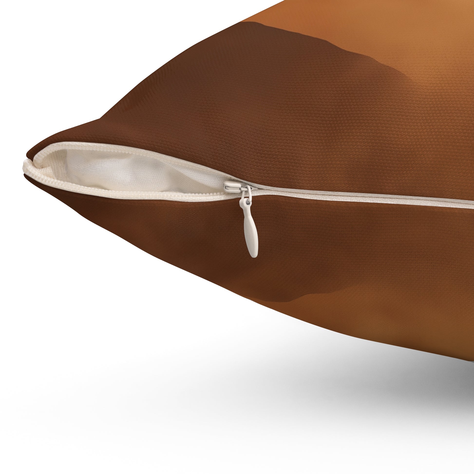 This square throw pillow features a warm sunset over mountain peaks and valleys, creating a peaceful nature-inspired mood in your space.